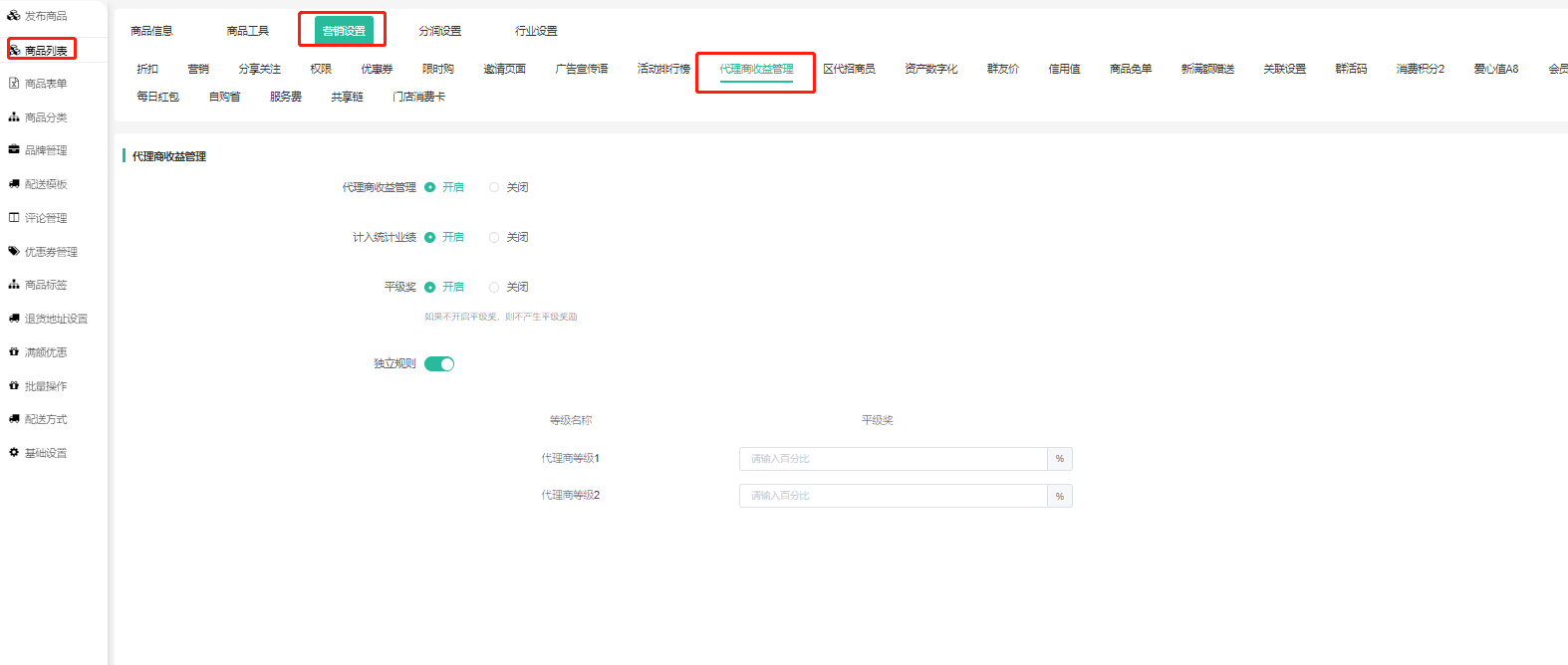 商品设置:商品编辑—营销设置—代理商收益挂件:开启后购买商品才会产生差价奖励