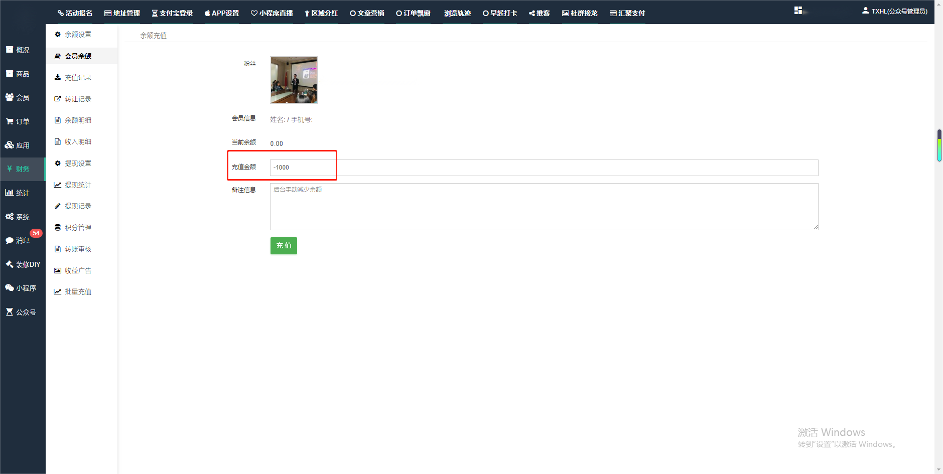 目录 搜索 展开 一、前期准备资料二、数字乡村码-上线操作指南1、服务号的申请流程及认证2、申请小程序流程3、开放平台绑定小程序和公众号三、数字乡村码-系统操作数字乡村码系统管理-概况数字乡村码-商品管理1、发布商品2、商品列表3、商品表单4、商品分类5、品牌管理6、配送模板7、评论管理8、优惠券管理9、商品标签10、退货地址设置11、满额优惠12、批量操作13、配送方式14、基础设置15、商品隐藏四、数字乡村码-会员管理1、全部会员2、会员等级3、会员分组4、资格申请5、会员设置6、推广中心设置7、会员邀请码8、会员关系链修改关系链修改记录9、会员合并记录10、账号注销管理11、会员设置中心五、数字乡村码-订单管理1、订单管理列表2、订单处理流程3、订单状态4、订单修改价格5、订单退款退货6、多包裹发货7、批量发货订单操作步骤8、催发货订单9、物流查询六、数字乡村码-财务管理1、余额设置2、会员余额3、充值记录4、转让记录5、余额明细6、收入明细7、提现设置8、提现统计9、积分管理10、转账审核11、收益广告12、批量充值七、数字乡村码-系统管理1、商城入口2、商城设置①、商城设置②、订单设置③、物流查询④、短信⑤、联系方式⑥、分类⑦、优惠券⑧、分享⑨、幻灯片⑩、广告位⑫、地图设置3、交易设置4、微信模板消息自定义消息模板(新版)自定义消息模板(旧版)小程序消息模板公众号模板消息变更公告5、语言设置6、权限管理7、多媒体管理八、数字乡村码-消息管理九、数字乡村码-应用管理十、数字乡村码系统-数据统计十一、数字乡村码-页面装修DIY1、模板管理2、店铺页面3、顶部导航4、底部导航5、DIY模板市场6、首屏广告7、基础设置8、装修DIY尺寸建议十二、供应商功能插件操作指南1、供应商2、门店-收银台门店申请和使用步骤门店管理①、门店-收银台 营销设置②、门店-收银台 分润设置门店分类门店申请门店审核门店商品门店商品订单收银台订单数据统计核销员基础设置默认设置门店装修3、微社区4、会务活动十三、营销插件操作指南活动报名提货卡新人奖微店问卷调查积分视频分享1、视频分享基础设置2、视频分享发现管理3、视频分享分类管理4、视频分享评论管理5、视频分享分红记录6、视频分享短视频中心每日红包幸运大抽奖签到优惠券二维码任务奖励优惠劵文章音频文章付费文章限时购新海报拓客卡操作流程积分活动素材中心视频红包十四、入驻门店应用类1、门店预约2、附近商品3、门店定位设置4、门店控制5、门店满额包邮6、门店满额减7、导入商品8、门店搜索9、门店股东10、核销券11、多门店核销1、商城后台设置2、前端功能演示十五、常见问题1、后台登录密码修改流程2、会员-余额,积分,后台如何进行充值与扣除3、如何修改上下级关系4、一种万能的获取商城小程序路径的方法 暂无相关搜索结果! 阅读次数:1780 本文档使用 模王系统 发布 2、会员-余额,积分,后台如何进行充值与扣除 会员-余额,积分,后台如何进行充值与扣除一.如何进行余额充值-扣除1.财务-会员余额-搜索会员昵称-右边点击充值余额2.扣除余额,只需要在充值金额前加上 - 号;比如充值-100,等于扣除100余额二,如何手动充值积分-扣除积分(充值与扣除逻辑跟余额是一样的)文档更新时间: 2024-01-05 14:28 作者:链上旅行